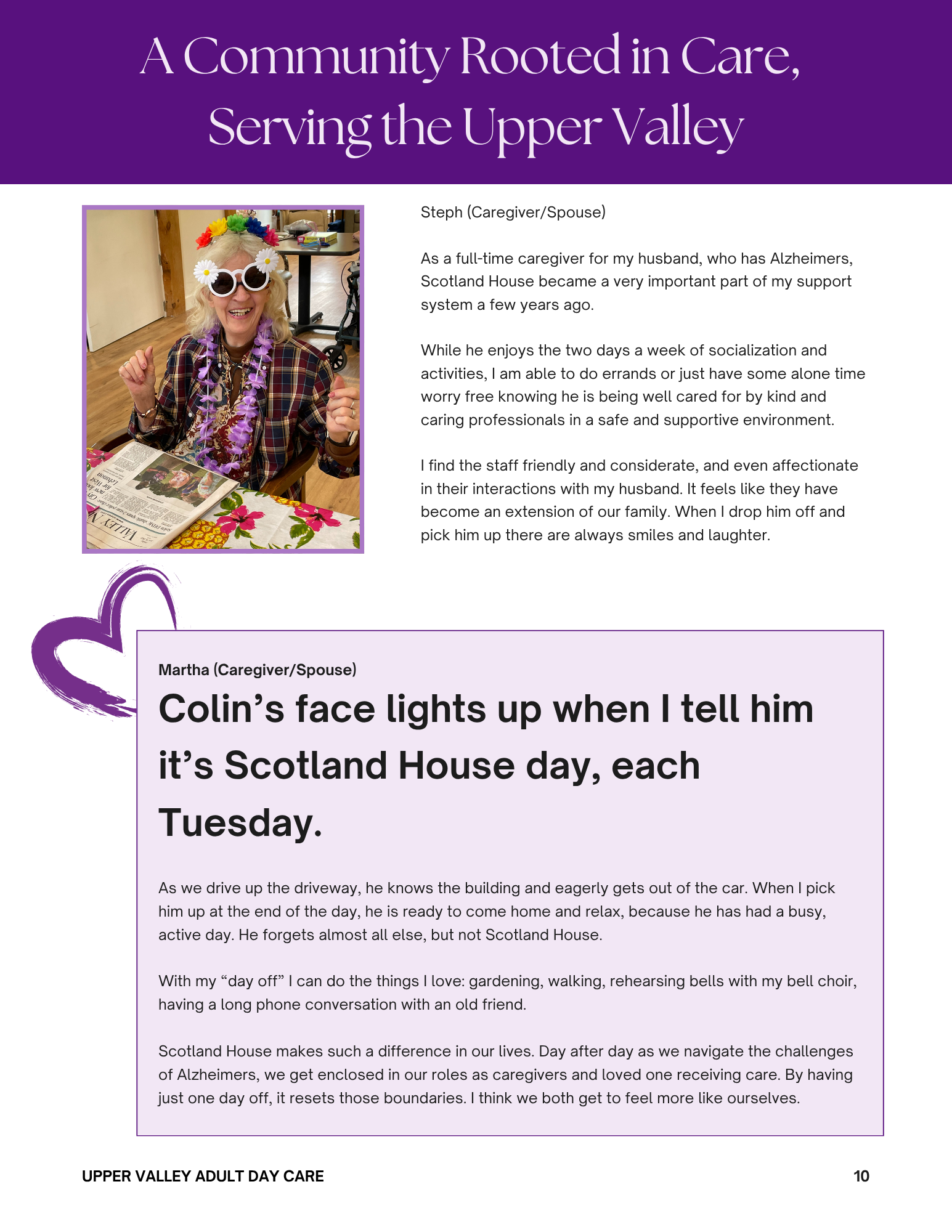 Upper Valley Adult Day Care has changed our life. Alzheimer’s took my wife of 25 years and left me with a person I no longer knew. I watched her spiral into a reclusive life. It was horrible and I slowly sunk into a depression thinking this was the end. A friend told me about an adult daycare that could help while I continued to work. The name alone, “adult daycare”, left me feeling like I had given up on this person who I loved. Like I was abandoning her, I cried all the way to work the first week she was attending the Scotland House. We had met Tonya a couple weeks earlier to talk about the program and I left feeling like this was a good decision. The first few weeks were tough as my wife adjusted to a social environment. The staff was amazing and I felt like I had a new family. Not staff, but a caring and supportive family. I felt a big weight had been lifted off my shoulders. Even more importantly, my wife was changing.