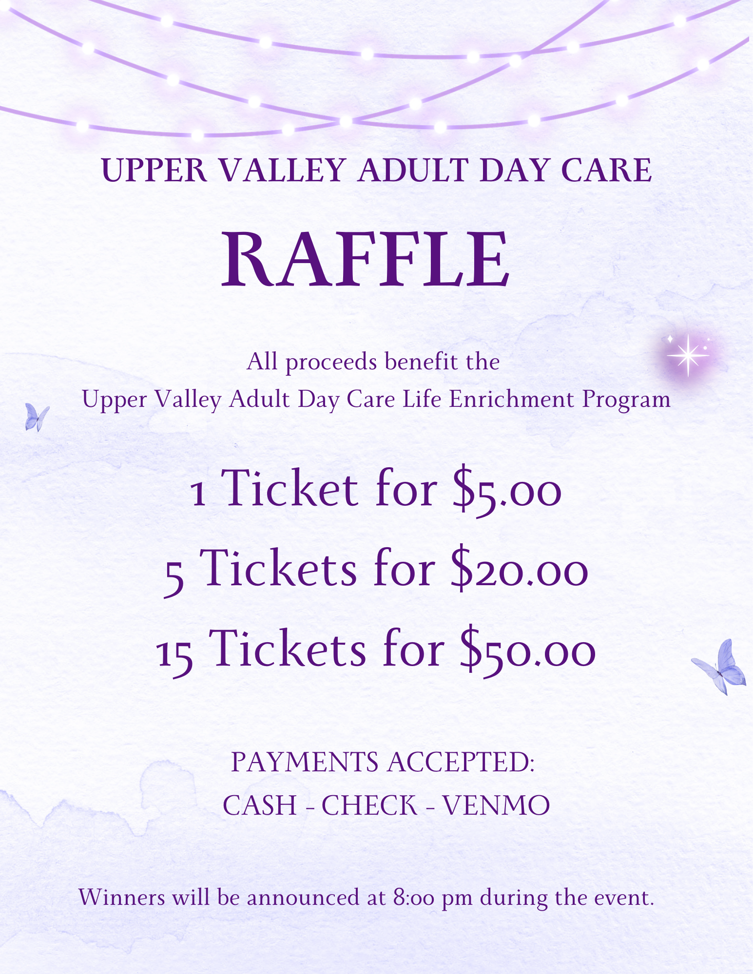 Purchase raffle tickets and help raise vital funds for Upper Valley Adult Day Care—supporting veterans, families, and individuals with physical and cognitive impairments. Every ticket helps make a difference!